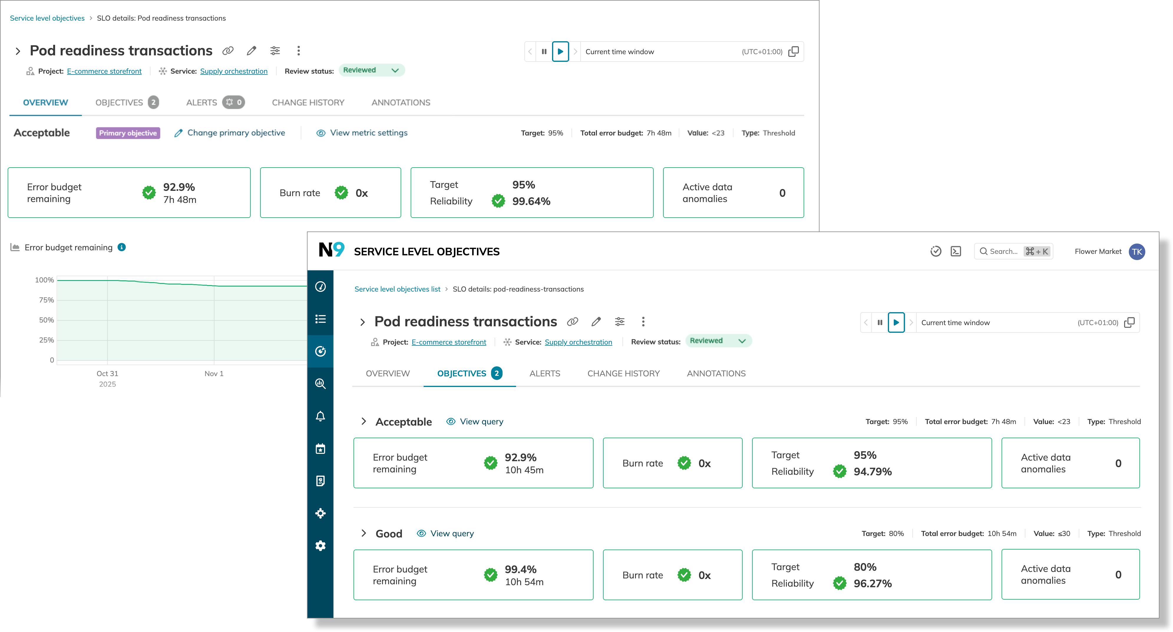 - Monitor performance: View real-time reliability metrics and error budget consumption