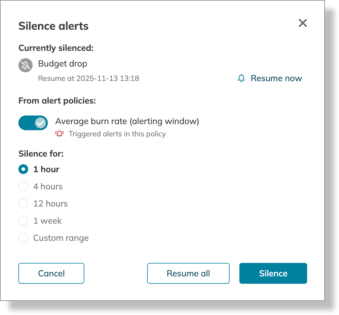 If you have any alert policies silenced, they're listed in the Currently silenced section. You can resume individual alerts or all alerts at once.